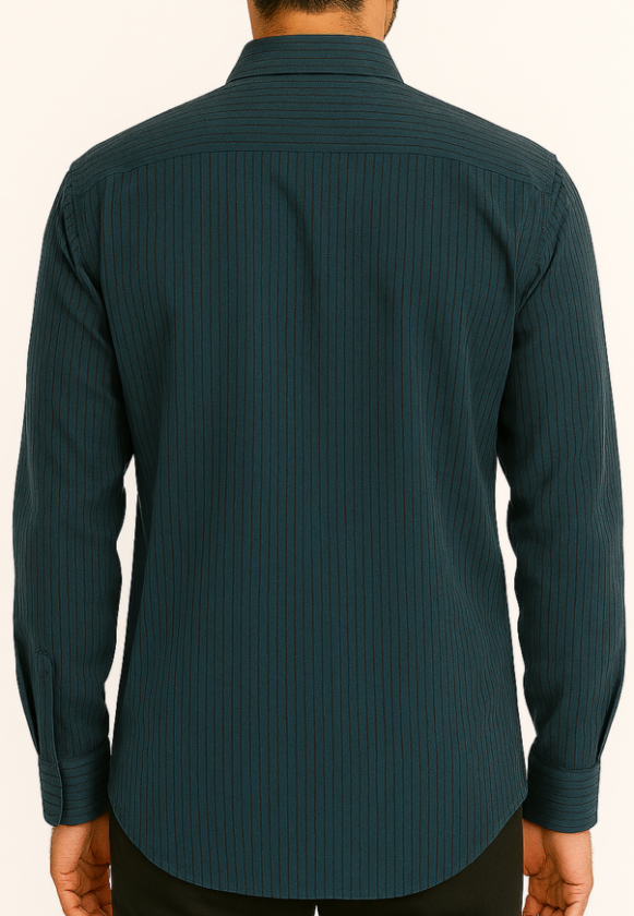 Upgrade your formal wardrobe with this navy-teal striped full-sleeve shirt, designed for the modern professional. Crafted from a soft cotton-blend fabric with a smooth matte finish, it features thin vertical black and dark purple stripes throughout. The shirt includes a classic spread collar, a single chest pocket with pattern alignment, and full button placket with dark buttons. The backside has a clean design with a horizontal shoulder yoke and no pleats for a sharp, tailored finish.