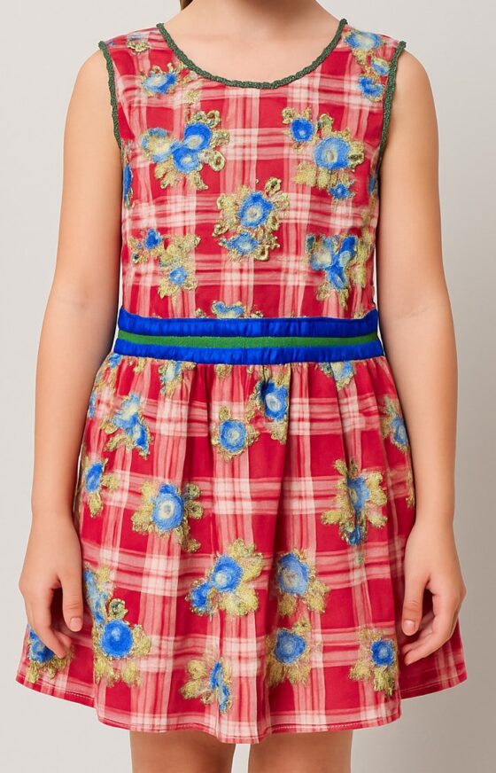 Girls' Red Check Floral Cotton Dress, This charming sleeveless cotton dress for girls combines playful elegance with everyday comfort. Crafted from soft, breathable fabric, the dress features a vibrant red plaid base adorned with delicate multicolored floral embroidery in shades of blue, green, and yellow. A fitted bodice flows into a gently flared skirt with a gathered waist, accentuated by a bold blue and green ribbon belt for a touch of contrast. The back showcases a practical zip closure and tiered skirt layers for added volume. Perfect for casual outings, festive occasions, or summer playdates.