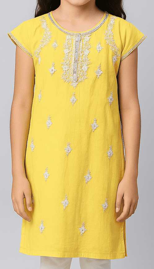 Bright and cheerful, this yellow kurti for girls features elegant white floral thread embroidery across the yoke and front panel. Designed with delicate cap sleeves and a rounded neckline highlighted with subtle silver piping, it brings together tradition and simplicity. The back has a small loop-button closure for ease of wear. Ideal for festive occasions or family gatherings, this kurti pairs perfectly with leggings or churidars.