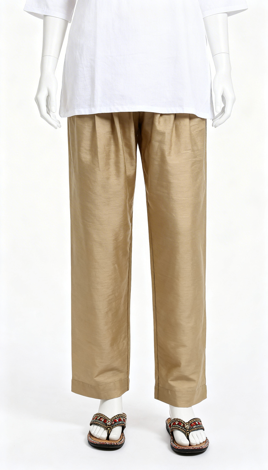 Soft brown tapered pant with elastic waist and clean straight finish, ideal for pairing with kurtas and ethnic tops.