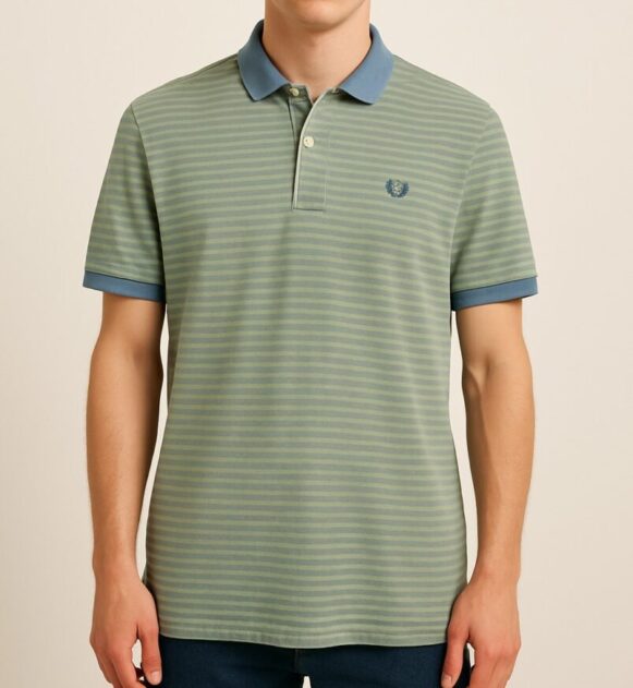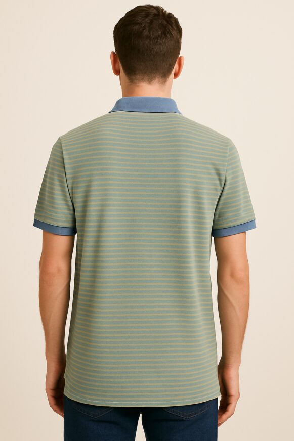 Step into smart casual style with this dusty green striped polo T-shirt. Crafted from soft cotton-blend fabric, it features a classic horizontal stripe pattern in muted tones. The contrasting denim-blue polo collar and sleeve cuffs add a refined touch, while the embroidered chest logo enhances its sporty appeal. Designed for comfort and versatility, this tee pairs effortlessly with jeans or chinos for a polished everyday look.