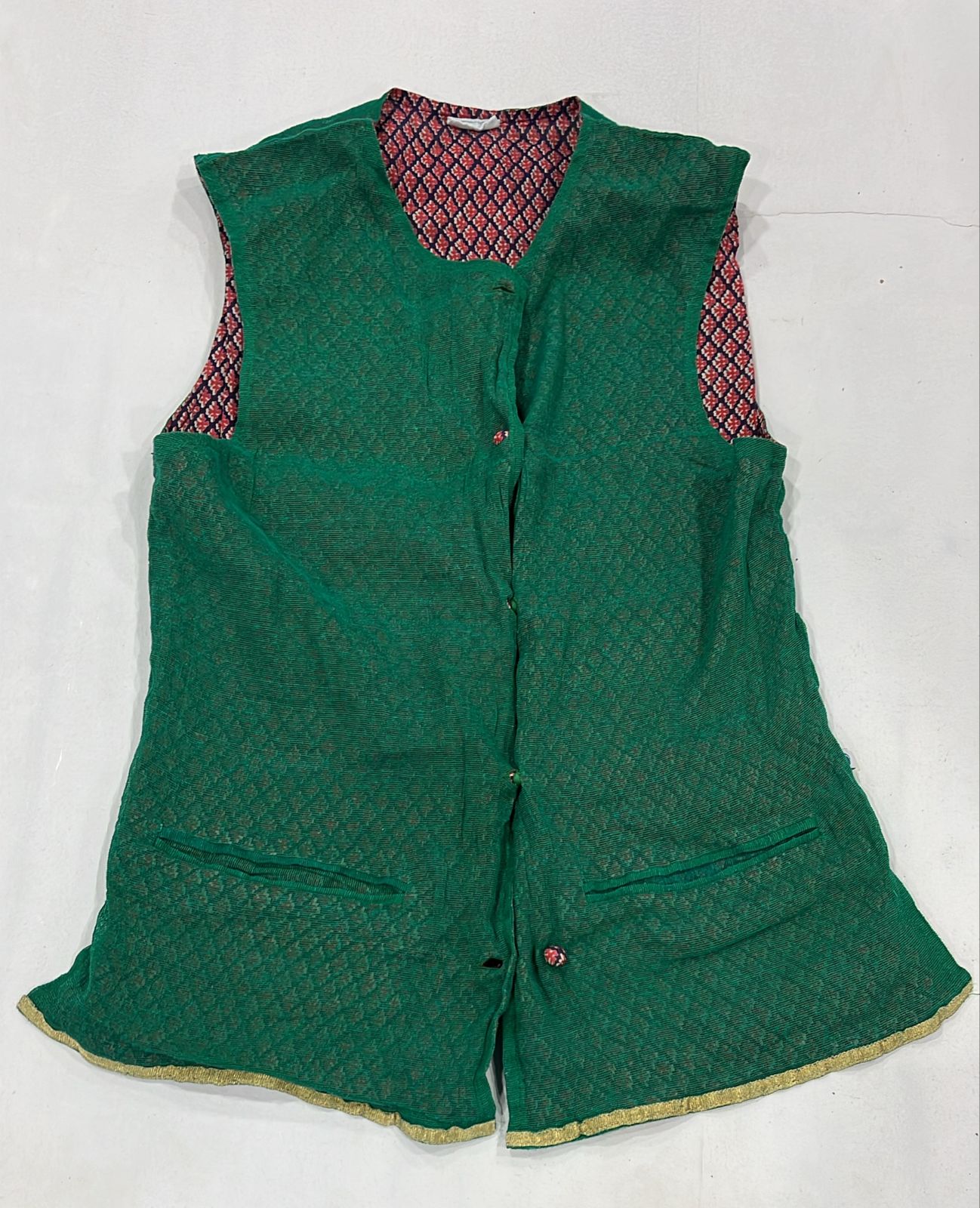 This ethnic jacket features a woven textured design with a sleeveless cut and contrasting lining, creating a traditional yet stylish layering piece. Suitable for festive or Indo-western styling.