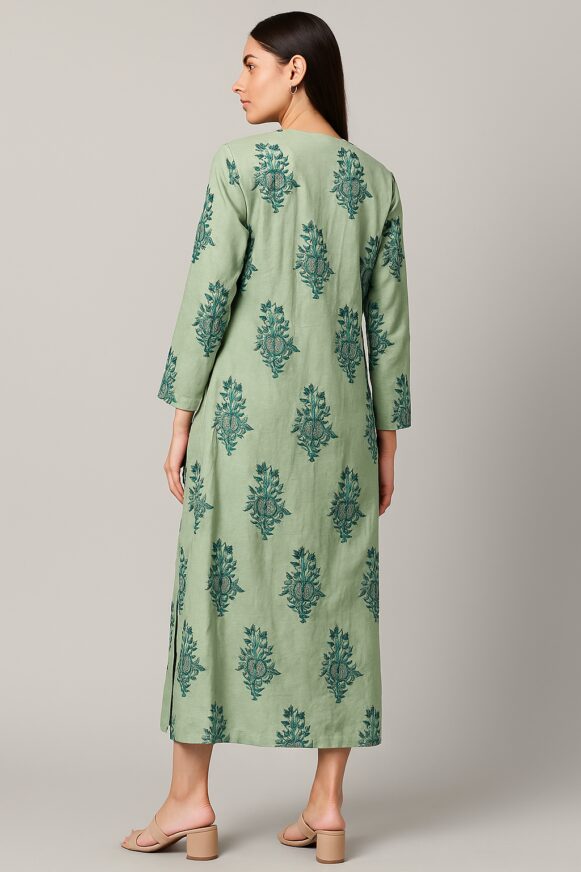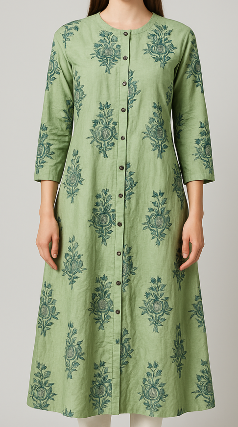 This elegant olive green longline kurta features intricate teal floral handblock prints all over, giving it a graceful ethnic charm. Designed with a round neckline and a button-down front placket, this kurta boasts a clean silhouette with 3/4th sleeves and side slits for ease of movement. Crafted in breathable cotton, it pairs well with straight pants or churidars for everyday sophistication.