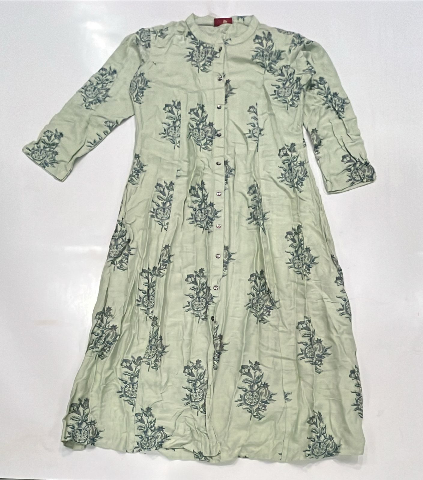 Green Handblock Print Kurta, Olive green cotton kurta with teal floral prints, round neck, and front buttons.