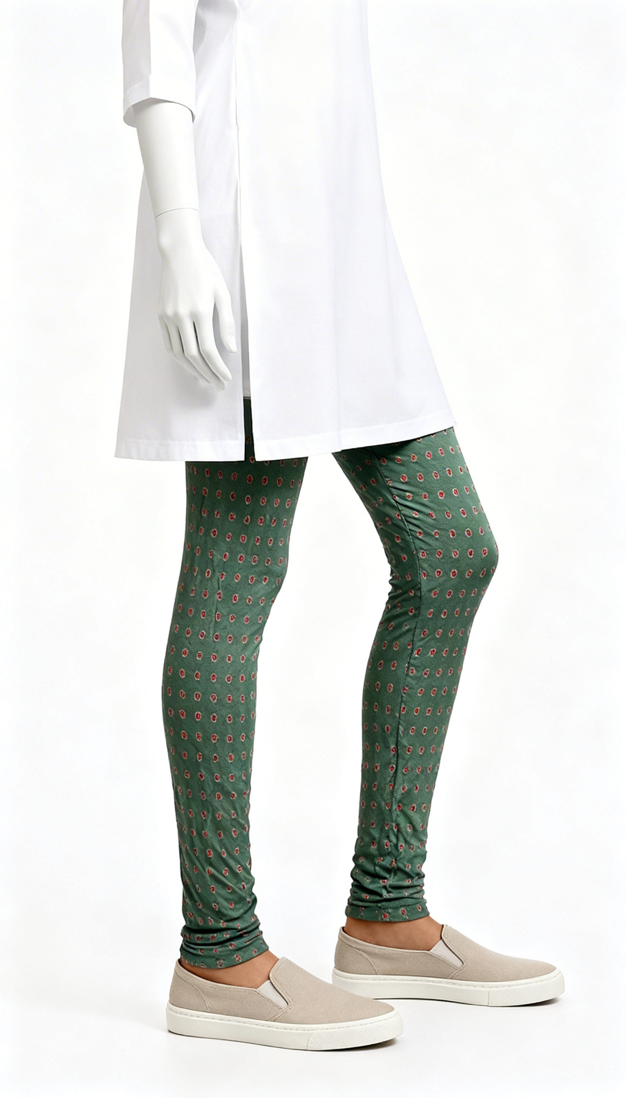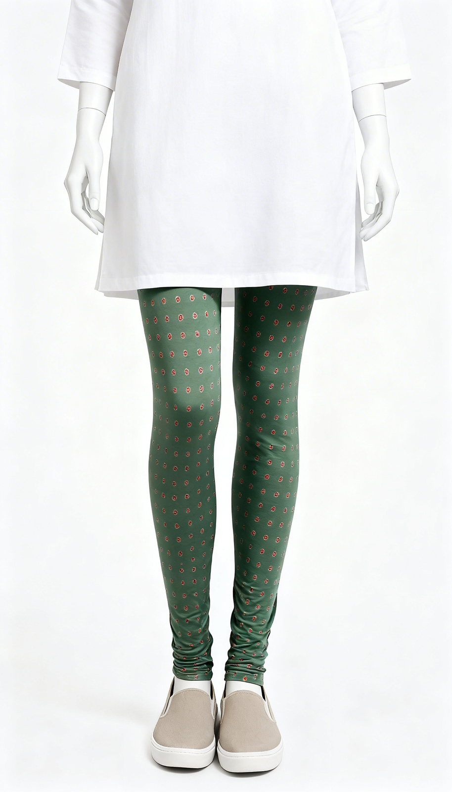 Green Printed Leggings Green Printed Leggings showcase a bodycon fit with geometric print and ankle length shape. The patterned surface adds subtle texture while maintaining crowd safe appeal. Designed for daily wear, the soft fabric allows breathable comfort and flexible movement. The slim tapered outline supports modern everyday styling with refined presence. An adaptable essential suited for multiple sizes available and easy reset continuity.