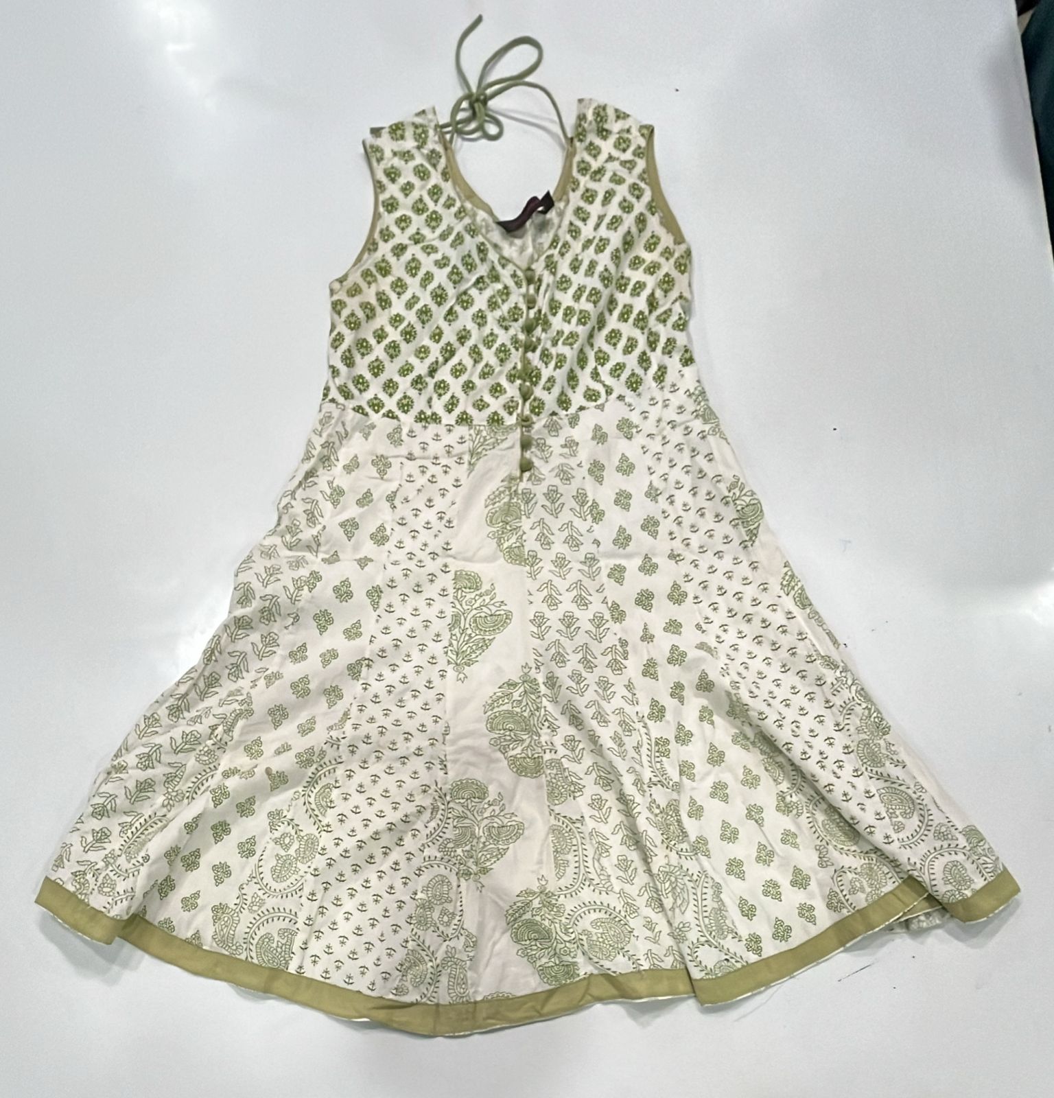 Green Sleeveless Printed Dress, Pastel green sleeveless A-line kurti with olive block prints, front buttons, and contrast hem detailing.
