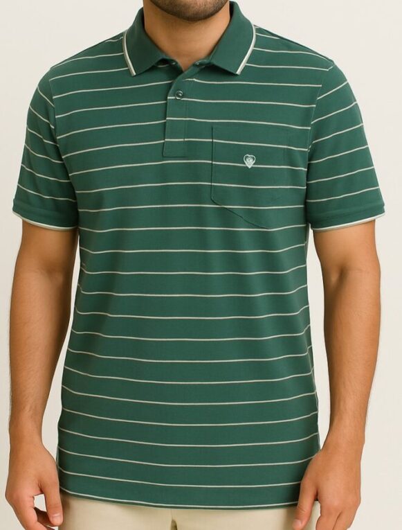 Green Striped Polo T-Shirt, This men's green polo T-shirt features clean horizontal white stripes across a rich forest green base, creating a timeless and sporty look. Crafted from a soft and breathable fabric, the tee comes with a classic polo collar, a two-button placket, and a convenient front chest pocket embroidered with a subtle logo. The sleeves and collar are finished with contrast tipping, adding a stylish touch. Ideal for casual outings or semi-formal settings, this T-shirt pairs well with chinos or denim for an effortlessly refined appearance.