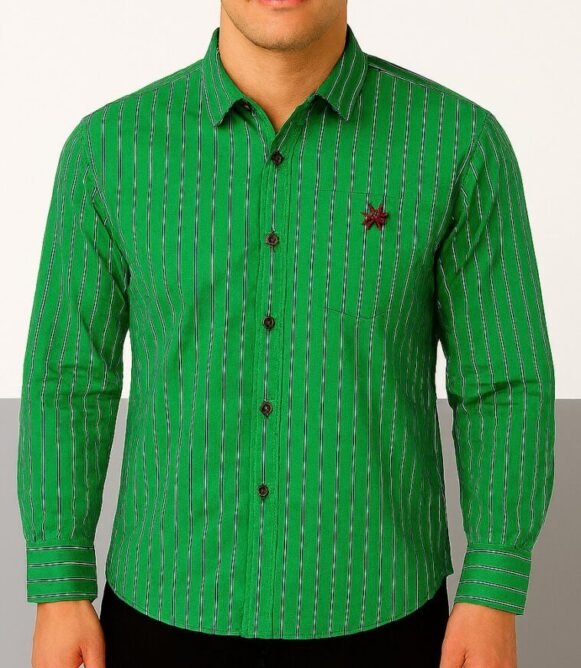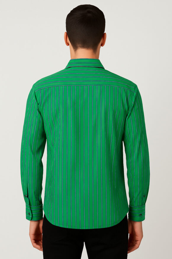 This men's full-sleeve shirt features a vibrant green base accented with vertical navy blue and white stripes. Made from soft, breathable cotton, the shirt offers both comfort and style. It includes a classic spread collar, front button placket with dark buttons, and a single chest pocket embroidered with a minimal star-style maroon logo. The back features a plain design with a horizontal shoulder yoke. The shirt has a slightly curved hem, making it perfect for both tucked and untucked looks.