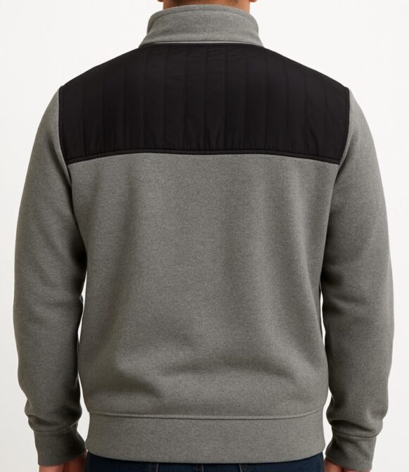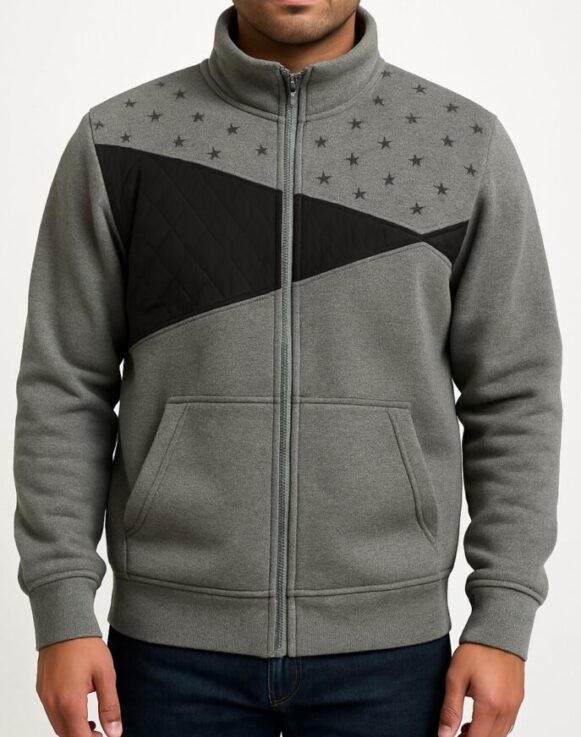 Grey Quilted Panel Jacket, Grey men’s jacket with star prints, diagonal quilted panels, zip-up closure, and high neck collar—perfect blend of comfort and style.