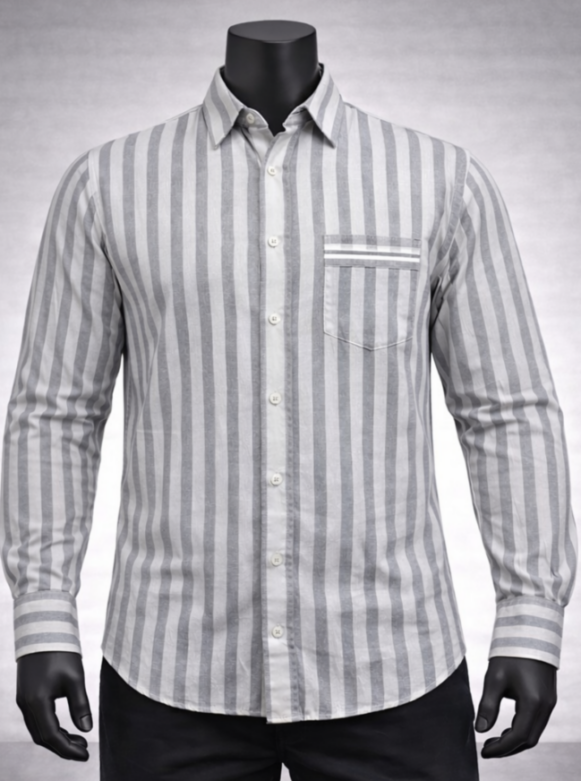 A grey cotton casual shirt featuring a vertical stripe pattern, designed for smart casual everyday wear, blends timeless structure with effortless comfort. The soft grey base offers a neutral and versatile foundation, making it easy to style across different settings. Vertical stripes run evenly across the fabric, creating a clean visual rhythm that subtly elongates the silhouette and enhances the shirt’s sharp yet relaxed appeal.