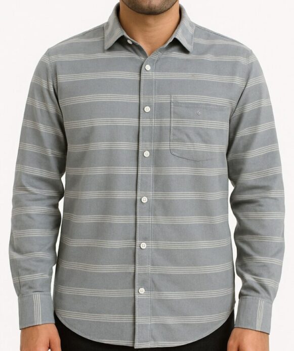 This full-sleeve grey striped shirt is tailored from a soft cotton blend fabric, making it ideal for both casual and semi-formal wear. The shirt features horizontal white stripes on a muted grey base, adding a sleek and modern aesthetic. It is designed with a spread collar, front button placket, and a left chest patch pocket with button detailing. The back is clean with a yoke panel for structured styling. Finished with curved hems and buttoned cuffs, this shirt offers comfort without compromising on style.