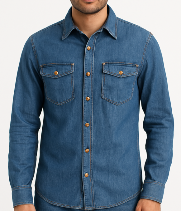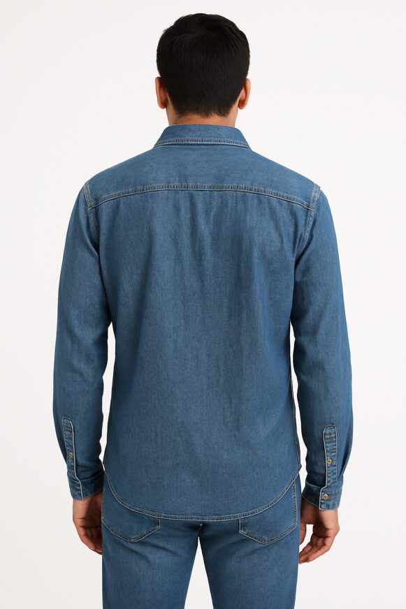 Indigo Denim Shirt, Full-sleeve indigo denim shirt with wooden-look buttons and dual flap pockets. The full-sleeve design adds structure and adaptability, allowing you to wear it buttoned up for a clean look or rolled at the cuffs for relaxed styling. Wooden-look buttons introduce a warm, earthy contrast against the deep indigo tone, enhancing the shirt’s natural, workwear-inspired appeal. These distinctive buttons serve as a subtle design highlight, adding character without overpowering the minimalist silhouette.