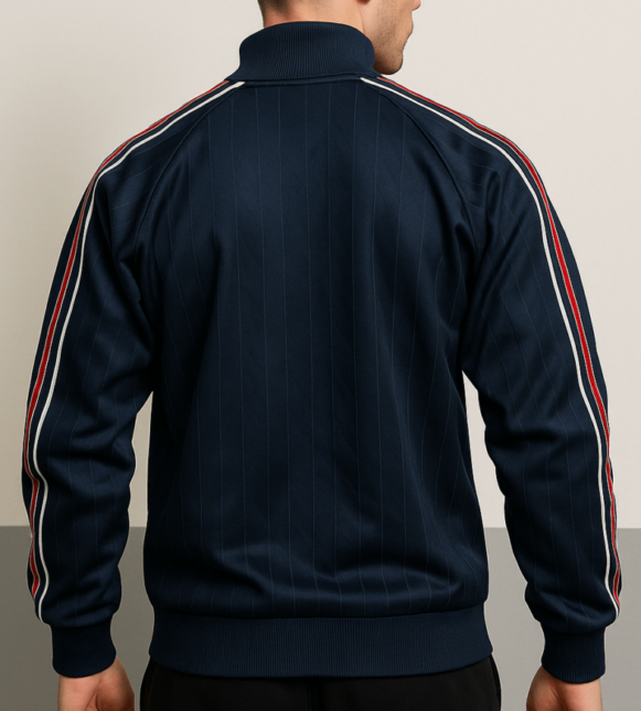 This Kaepa navy blue track jacket blends sporty style with modern comfort. Designed with a ribbed high collar and full zip closure in bold red, the jacket features signature white and red contrast panels at the chest and striped detailing along the sleeves for a dynamic look. Made from a soft, durable fabric with subtle vertical pinstripes, it ensures ease of movement and long-lasting wear. Perfect for workouts, outdoor activities, or casual styling.
