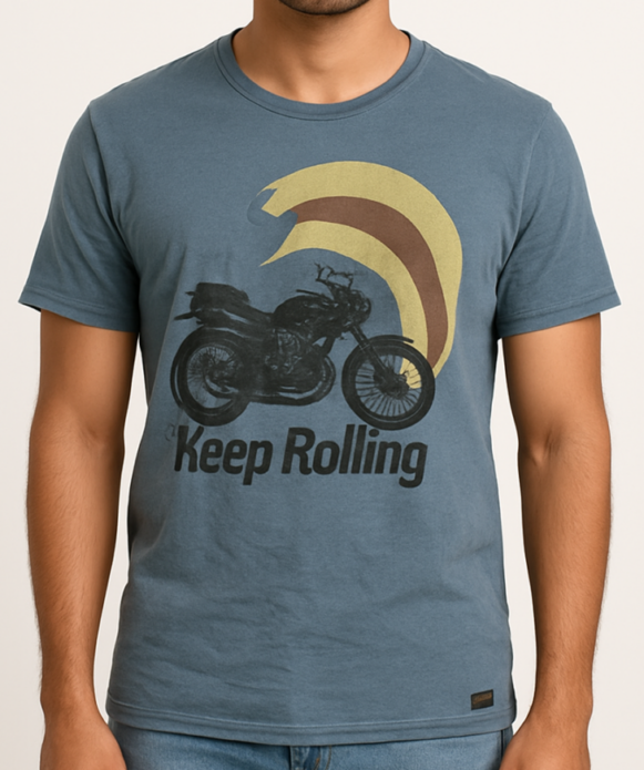 Stay effortlessly cool in this vintage-style graphic T-shirt for men. Designed in a faded blue shade, the tee features a bold front graphic of a motorcycle with a retro rainbow motif and the text "Keep Rolling." Made from soft cotton fabric, it offers a comfortable fit with a crew neckline and short sleeves. Perfect for casual hangouts, rides, or relaxed weekends, this tee combines style and ease for a bold everyday statement.