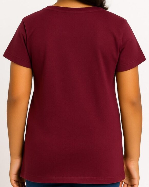 Kids Maroon Dot Cartoon Print T-Shirt, Girls' maroon polka dot T-shirt with Tweety print and plain back – soft cotton comfort with cartoon charm.