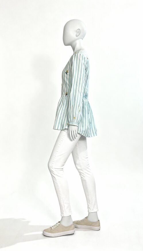 This A-line top is designed to bring together comfort, charm, and everyday style in a flattering silhouette. Featuring vertical stripes, it creates a clean and elongated look that adds visual interest while maintaining a light and airy feel. The striped pattern forms a perfect base for the delicate floral embroidery, which adds playful texture and a touch of femininity to the overall design.