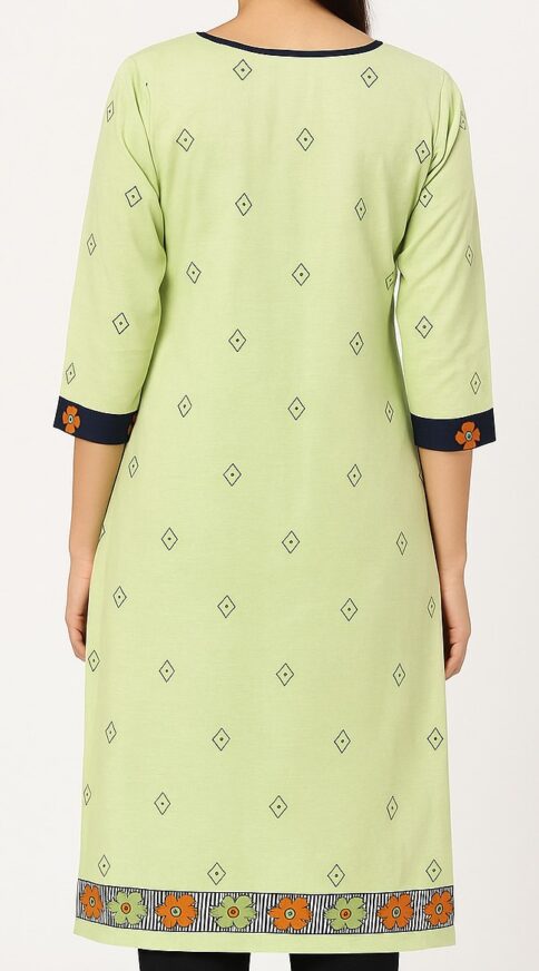 This elegant light green straight kurta is designed with a subtle all-over diamond print, complemented by a contrasting navy placket with a single button. The sleeves feature a navy floral border, adding a stylish touch. The hemline is highlighted with a floral printed border in orange and green tones, enhancing the overall charm. Made from breathable fabric, this kurta is perfect for daily wear and casual outings, offering comfort with a modern ethnic appeal.