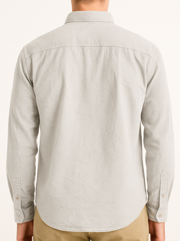 Light grey casual full sleeve shirt with pink buttons, This men's light grey full sleeve shirt is crafted from breathable, soft cotton fabric, providing a relaxed and comfortable fit. Designed with a classic pointed collar, front button placket featuring subtle pink-toned buttons, and a neatly sewn chest pocket on the left side, it is perfect for both casual and semi-formal occasions. The back has a clean horizontal yoke with no pleats for a sleek silhouette. Ideal for styling with chinos or jeans.