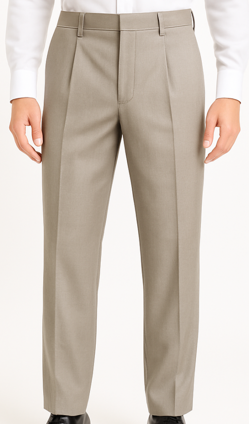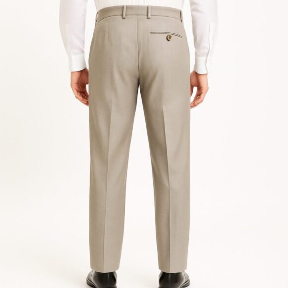 Elevate your formal wardrobe with these light stone-grey men’s trousers crafted from a smooth, lightweight fabric. Featuring elegant pleats at the front, side pockets, and a clean concealed fly, they provide a crisp tailored look. The back showcases a single welt pocket with a secure button. Perfect for office wear or formal events, these trousers offer both sophistication and comfort with a structured straight fit.