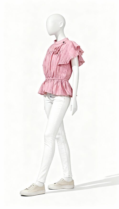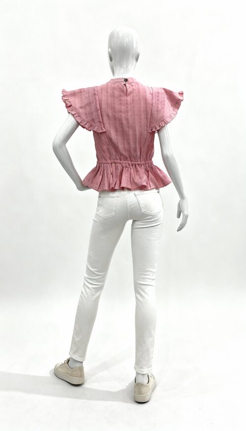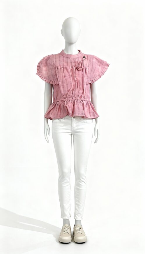 Light pink peplum top designed with layered ruffle sleeves and a softly gathered waist for a feminine silhouette. Styled with a flared hem and lightweight fabric for brunch and casual outings.