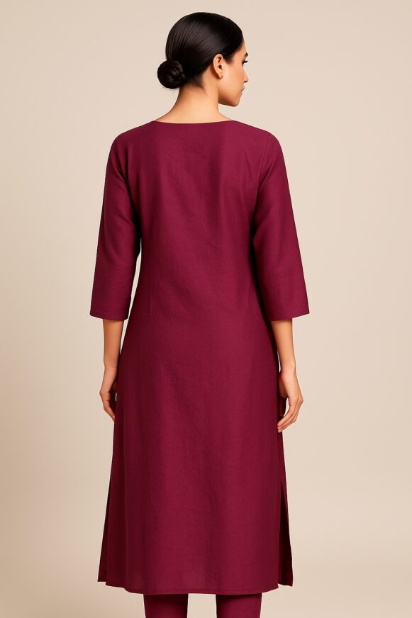 Elevate your ethnic wardrobe with this elegant magenta straight kurta crafted in a soft, breathable fabric. The front is beautifully adorned with intricate golden thread embroidery forming a vertical floral motif extending from the neckline to mid-bust, adding a rich and traditional touch. Designed with a wide scoop neckline and 3/4th sleeves, it offers both style and comfort. The plain back, clean silhouette, and side slits enhance its graceful appeal—perfect for festive gatherings or elegant daywear.