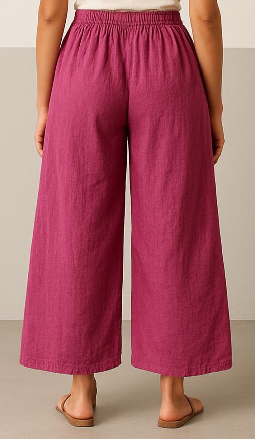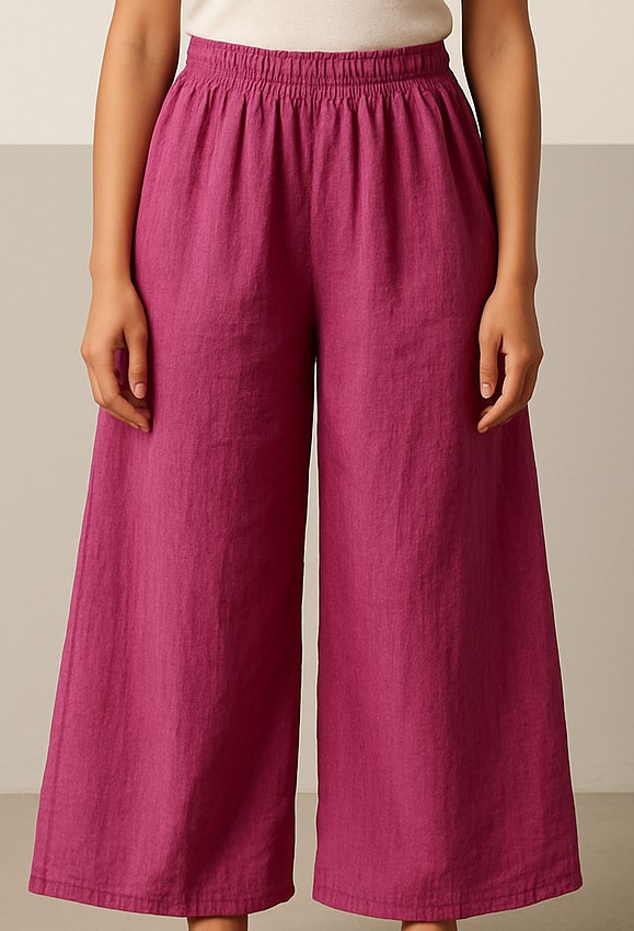 Step into comfort and effortless style with these magenta wide-leg culotte pants crafted from breathable linen fabric. Featuring an elasticated waistband for a secure yet flexible fit, these pants offer a relaxed silhouette that flatters all body types. The high-rise waist and cropped length create a balanced, elegant look, perfect for casual outings, work-from-home wear, or leisurely strolls. Pair it with a tank top or kurta for a chic, laid-back look.