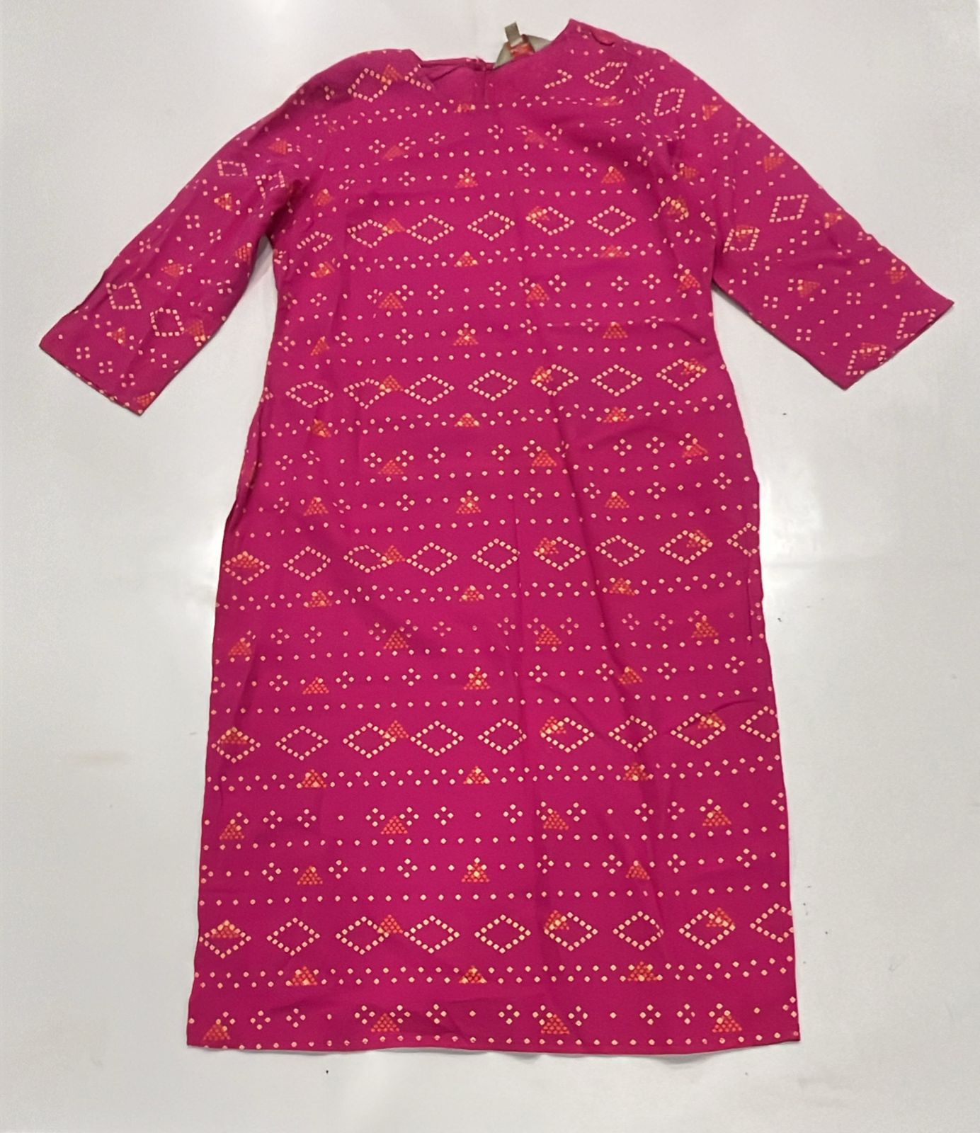 This magenta straight kurta blends traditional charm with modern comfort. Made from a soft, breathable fabric, it features a vibrant dotted geometric print in a bandhani-inspired pattern. The round neckline and 3/4 sleeves offer a timeless silhouette, while the button-loop closure at the back ensures a secure fit. Ideal for both casual and semi-formal occasions, pair it with leggings or palazzos for a versatile ethnic look.