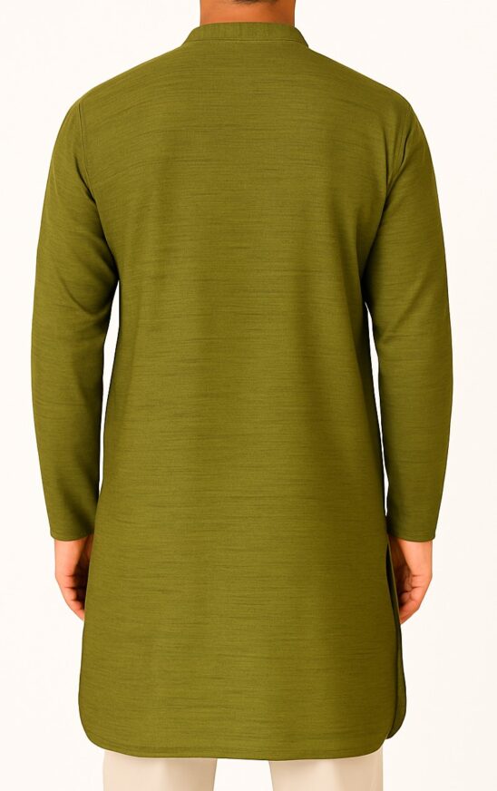 Mandarin Olive Kurta, This elegant olive green kurta is crafted from a smooth, textured fabric that brings richness and depth to its solid color. Featuring a stylish mandarin collar and a front button placket with four classic brown buttons, the design offers a clean, contemporary look. The straight hem and side slits ensure both mobility and traditional charm.