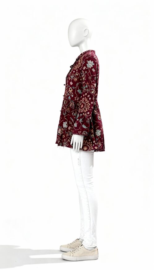 A maroon, floral-printed, long-sleeve A-line tunic with a gathered waist and tassel-detail neckline.