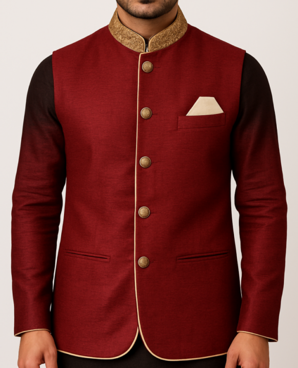 Maroon Nehru Jacket with Beige Collar, Maroon Nehru jacket with gold mandarin collar, antique buttons, beige piping, and matching pocket square. Ideal for ethnic occasions.