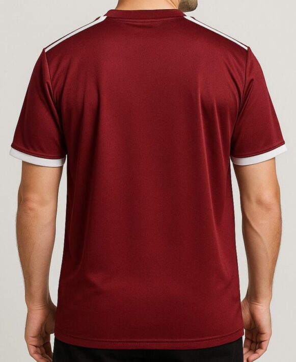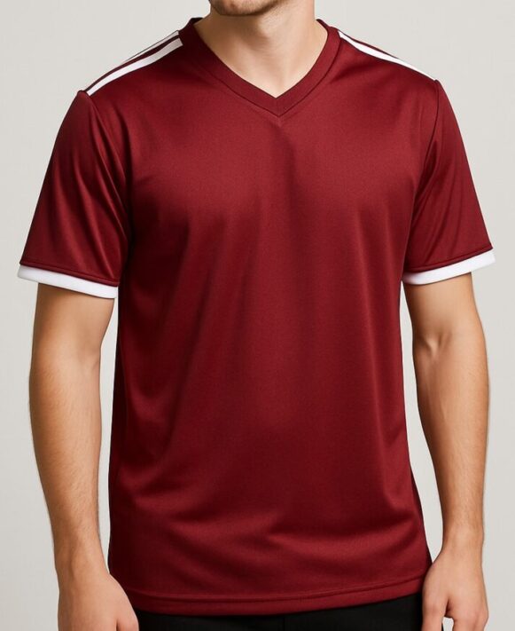 Maroon V-Neck Sports T-Shirt, Men’s maroon V-neck sports T-shirt with white contrast details, made from breathable polyester for all-day comfort.