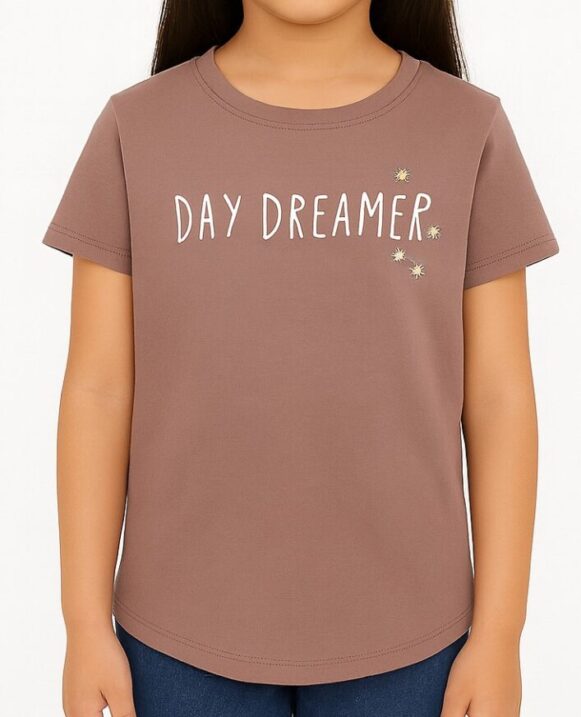 Mauve Graphic T-Shirt, Girls' mauve cotton T-shirt featuring "DAY DREAMER" graphic with daisies, short sleeves, and curved hem, The soothing mauve shade creates a calm, trendy base that pairs beautifully with a variety of bottoms, from denim shorts to leggings and skirts. At the center, a charming “DAY DREAMER” graphic is decorated with daisy accents, adding a touch of whimsy and positivity. The floral artwork brings a fresh, youthful energy that reflects imagination and carefree spirit, making the tee as expressive as it is stylish.