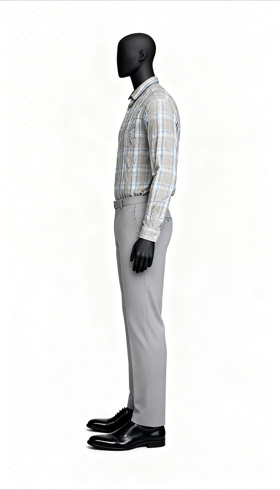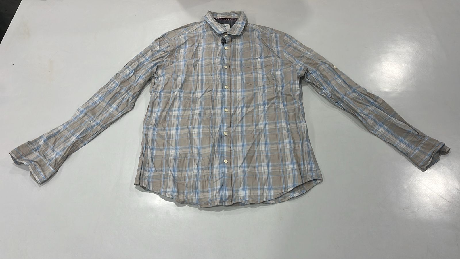 Beige-blue check shirt perfect for semi-casual everyday styling and workwear.
