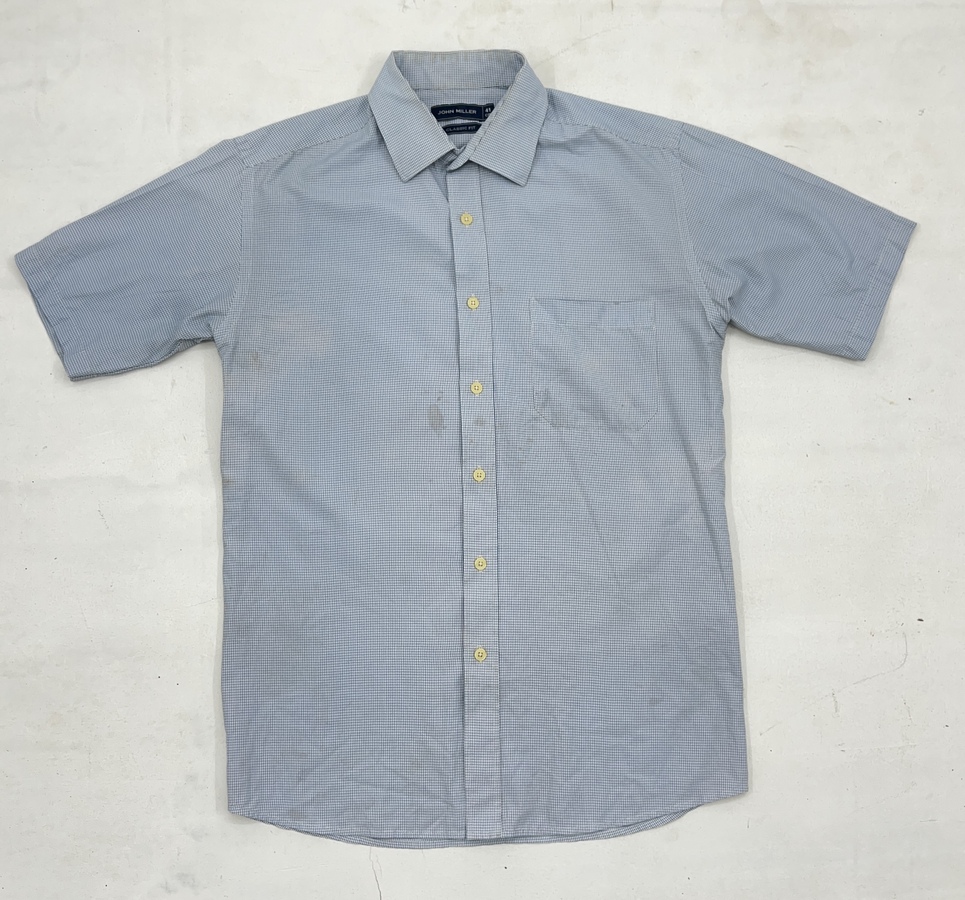 Men’s blue micro-check shirt featuring short sleeves, regular fit and button closure, suitable for office and smart casual use.