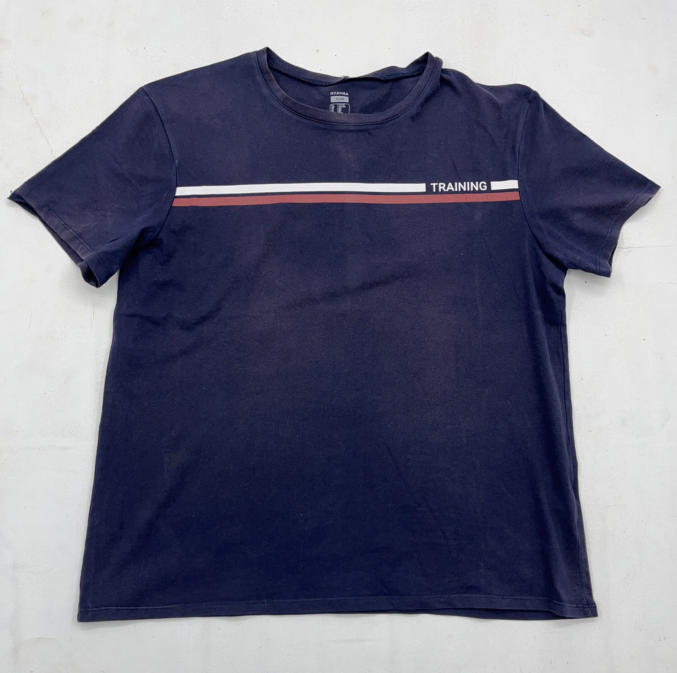 Men casual navy blue t-shirt featuring printed stripe detail for daily wear
