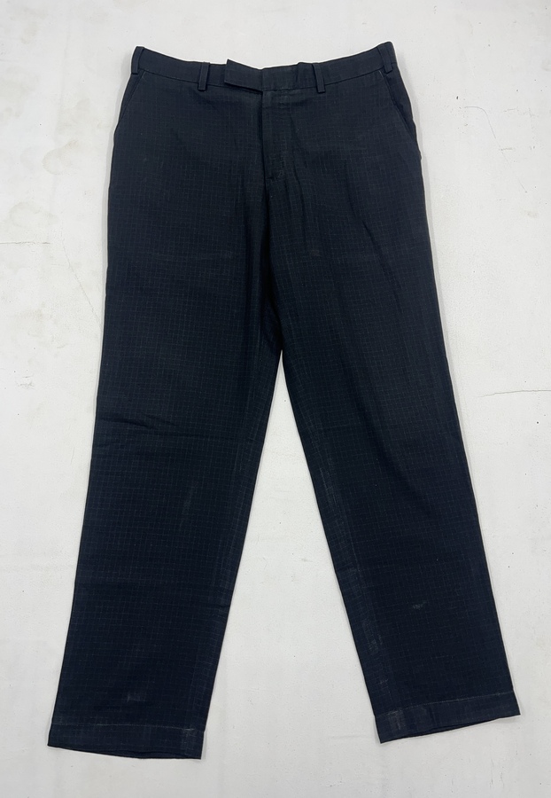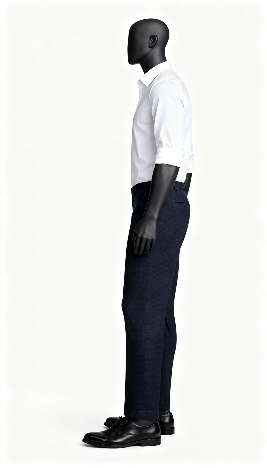 Navy blue formal trousers with textured pattern and tailored fit designed for professional office styling