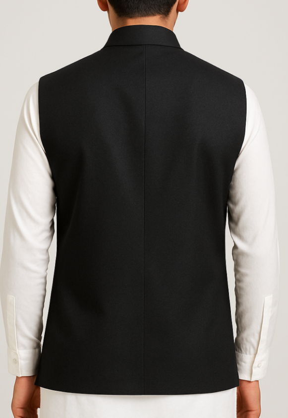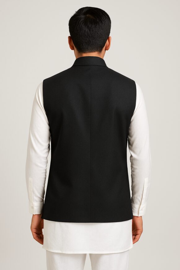 Men’s Black Nehru Jacket, This classic black Nehru jacket is the perfect fusion of traditional elegance and modern tailoring. Crafted in a premium suiting fabric, it features a structured silhouette with a Mandarin collar, five-button front closure, and three welt pockets (one on the chest and two at the waist). The jacket is fully sleeveless, designed to be layered over kurtas or shirts for a formal ethnic look. The back is clean and structured with a center seam for refined shape retention. Ideal for festive occasions, weddings, or cultural celebrations.