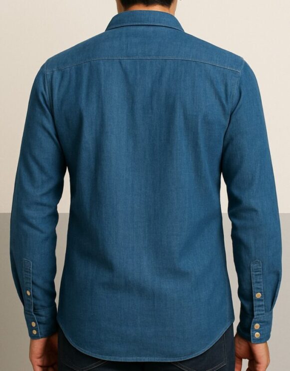 A classic men’s denim shirt crafted in soft cotton denim fabric. It features a collared neckline, snap button placket, long sleeves with buttoned cuffs, and two flap chest pockets with snap button closure. The shirt has a regular fit with a curved hemline, ideal for both casual and smart-casual looks.