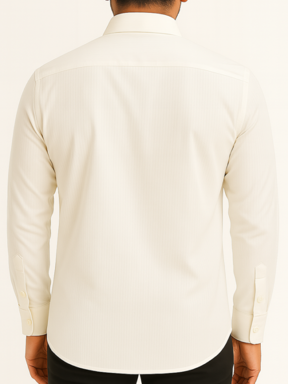Men's Formal Shirt, Elevate your formalwear collection with this timeless off-white shirt tailored for a clean and structured look. Crafted from high-quality cotton-blend fabric with a subtle vertical stripe texture, this shirt features a crisp pointed collar, full button-down front, and a single chest pocket. The long sleeves are finished with classic buttoned cuffs, while the back remains clean with a straight yoke and no pleats. Ideal for business meetings, events, or everyday office wear.