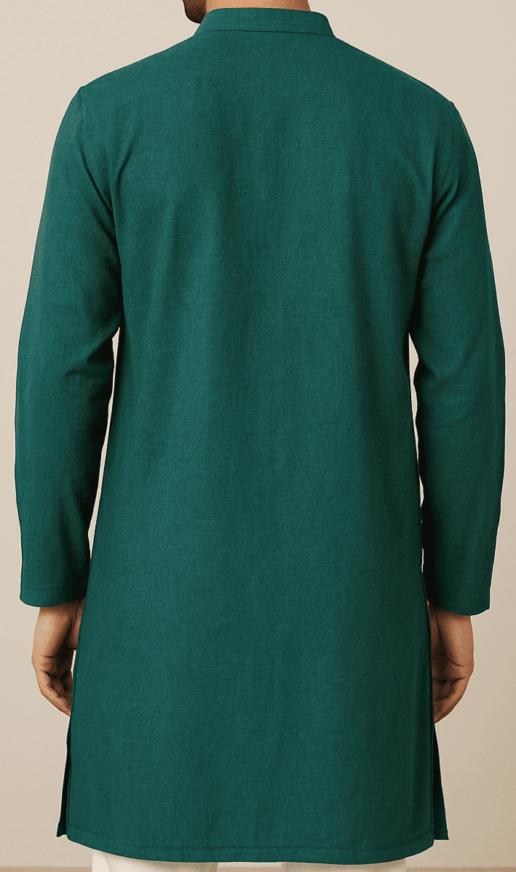 This green cotton kurta features a classic mandarin collar with a button placket and long sleeves, offering a balanced blend of tradition and everyday comfort. The refreshing green tone adds a lively yet grounded presence, making it suitable for a variety of occasions. Crafted from breathable cotton, the fabric ensures softness against the skin and promotes airflow, allowing comfortable wear throughout the day.