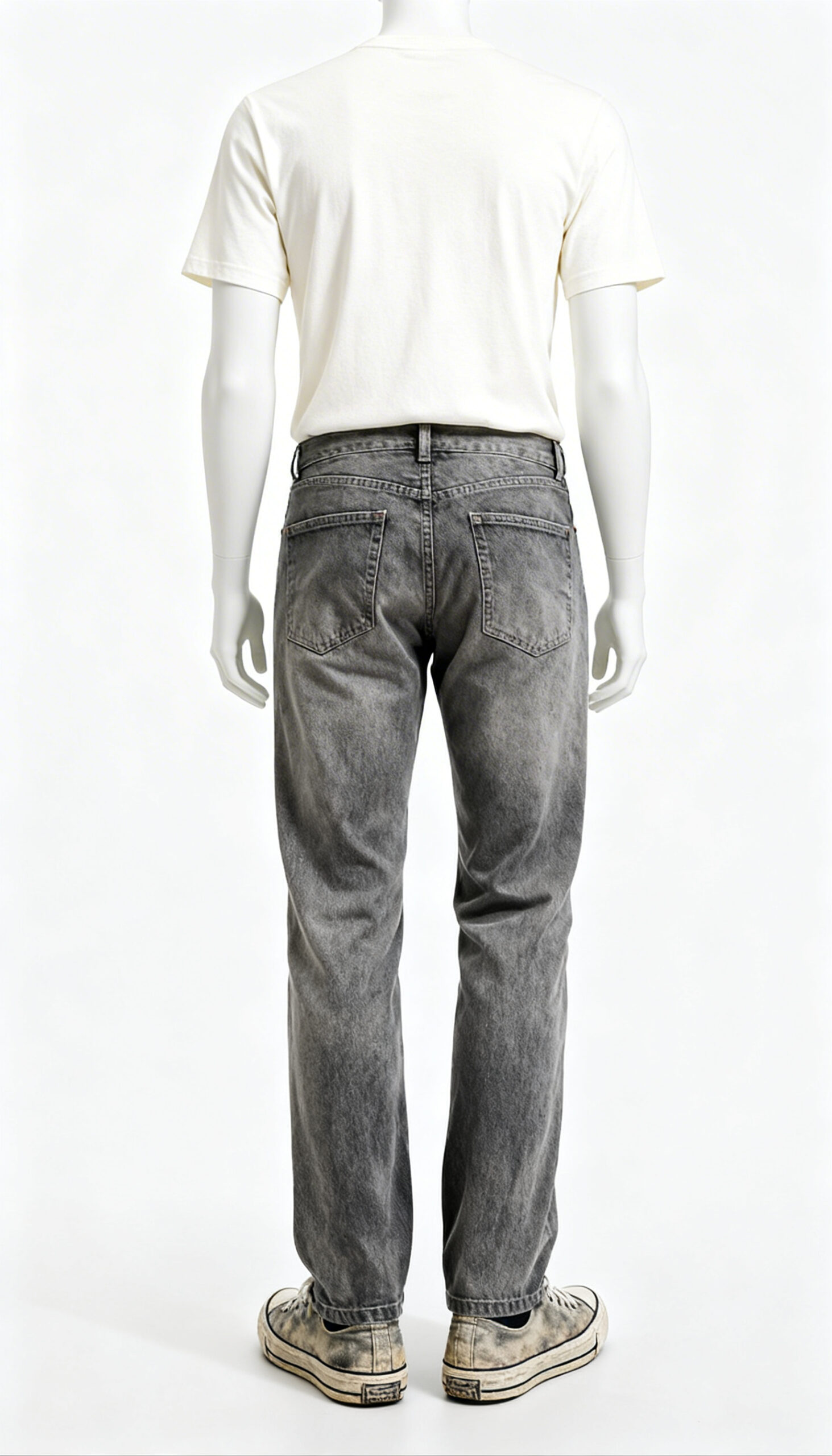 Comfortable grey chino pants with a clean, straight fit, soft fabric, side pockets, and buttoned back pockets.