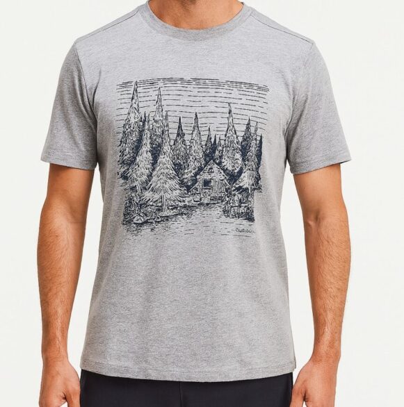 Add an outdoorsy vibe to your wardrobe with this heather grey cotton T-shirt featuring a detailed navy forest-and-cabin sketch on the chest. Crafted from breathable cotton-blend jersey, it offers all-day comfort with its relaxed fit and clean crew neckline. The back remains plain for a minimal, modern finish.