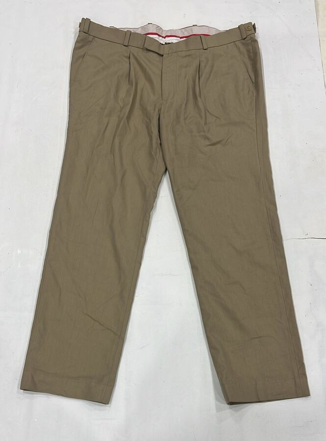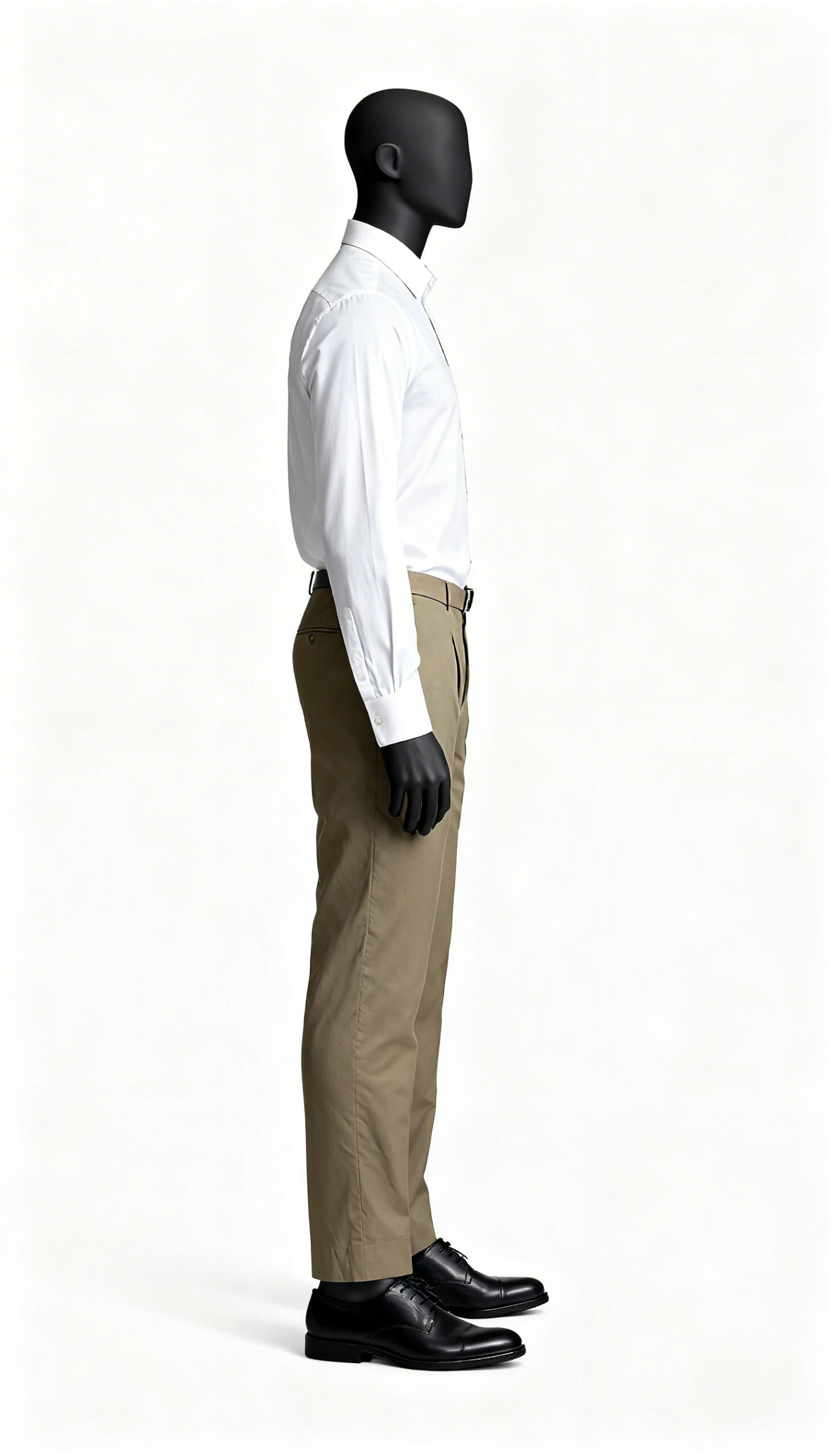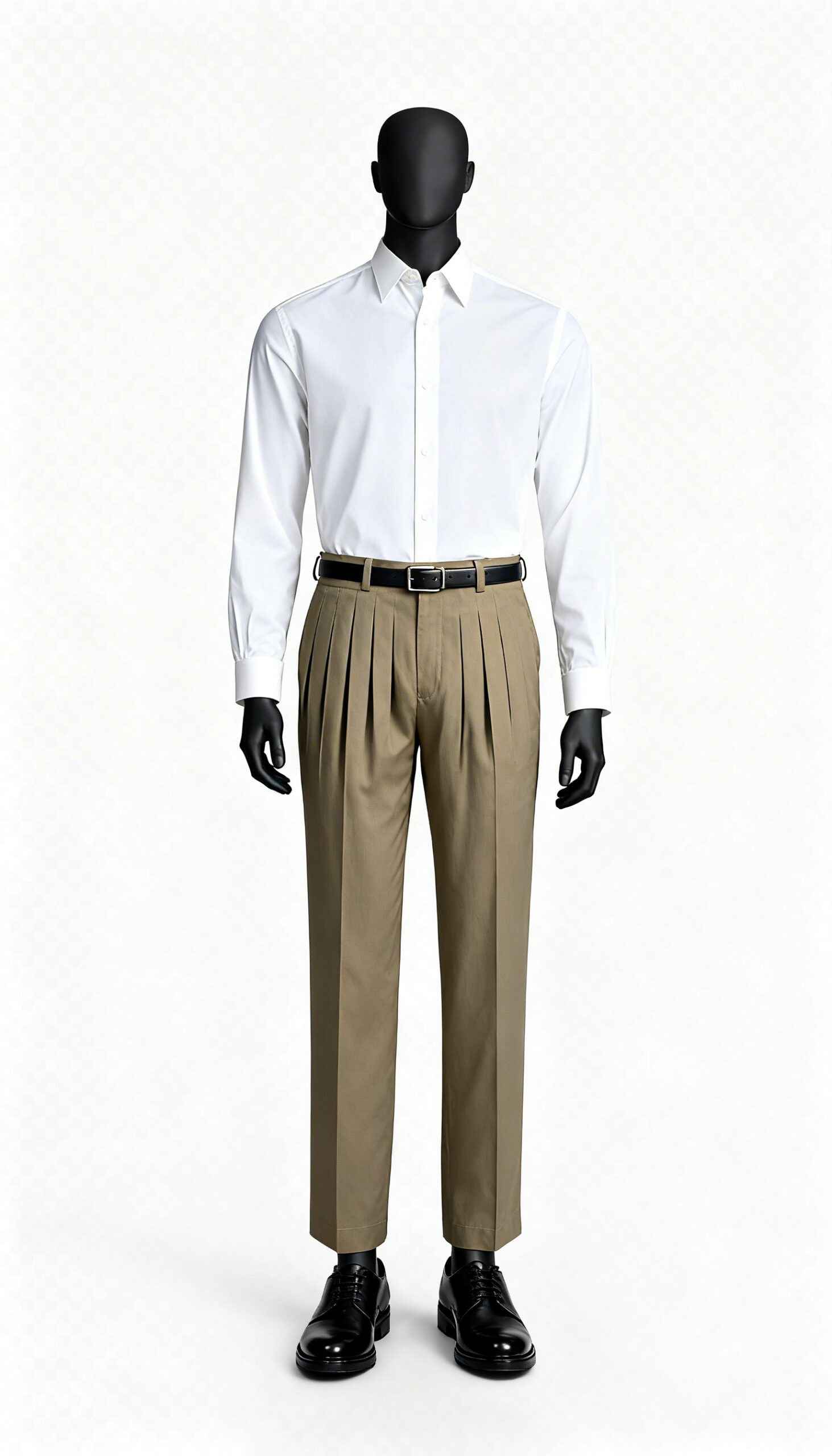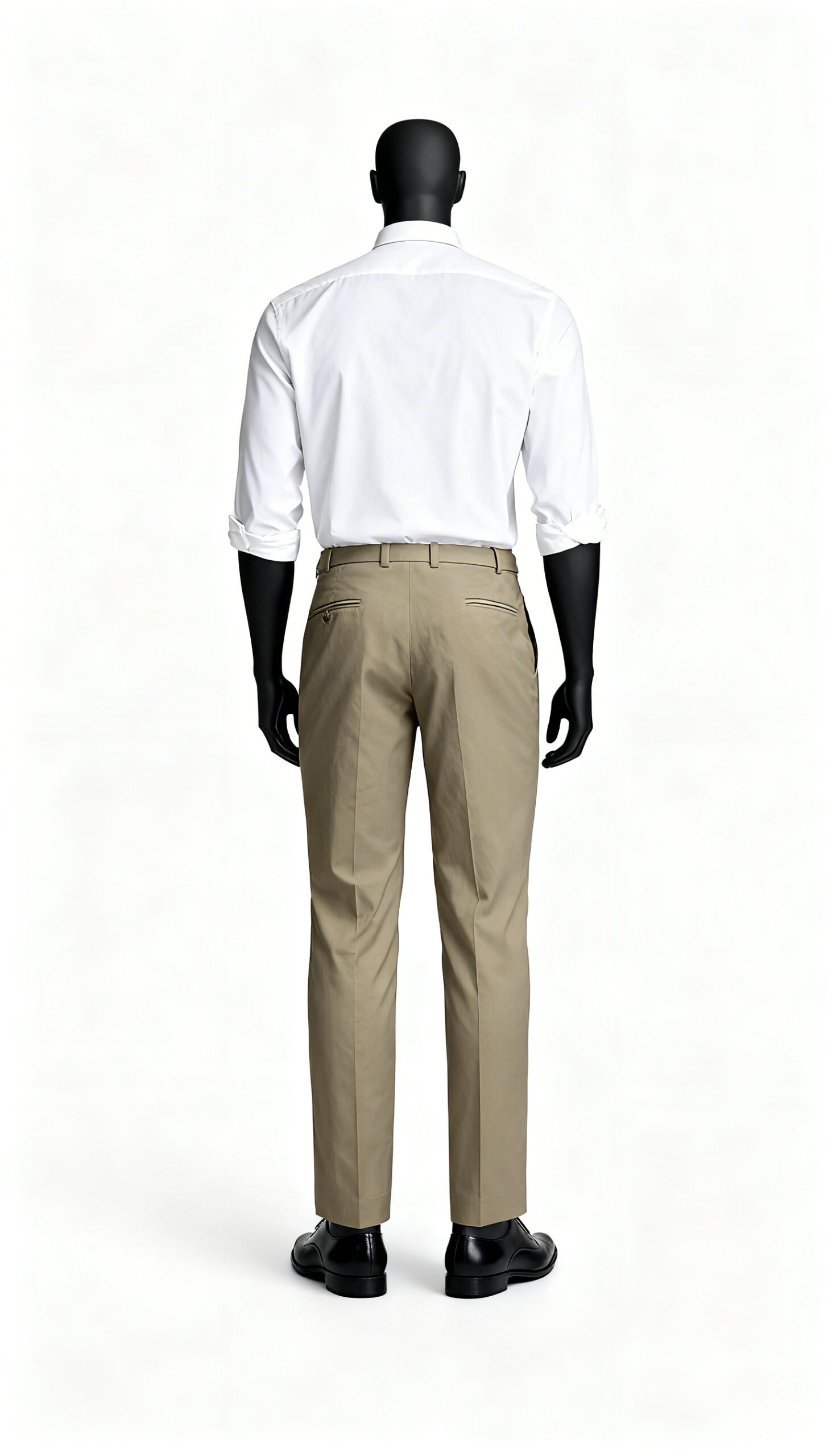 Khaki trousers with clean tailoring, belt loops, smooth finish and everyday formal usability.