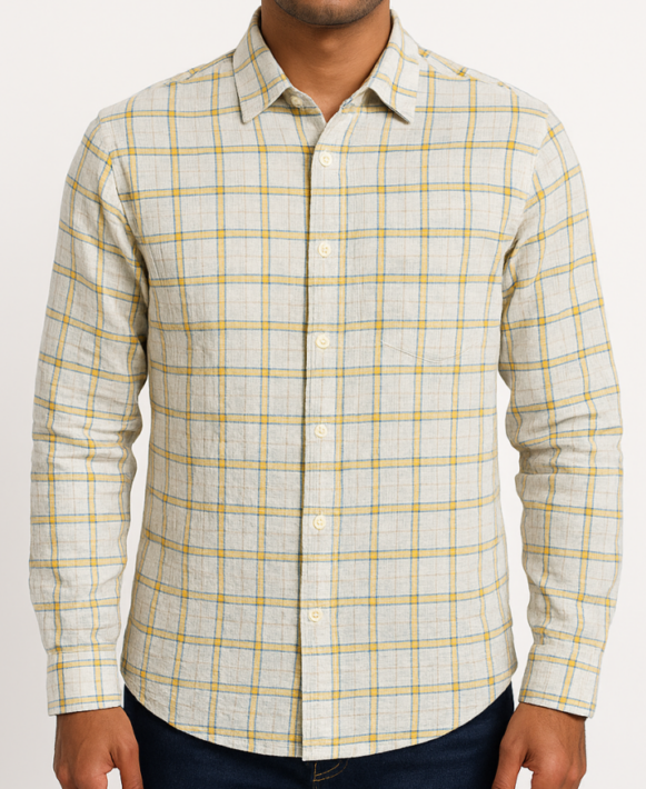 Men's Light Beige Checked Casual Shirt, Cotton long sleeve shirt with yellow and blue checks, featuring button front, left chest pocket, and diagonally-cut back yoke.