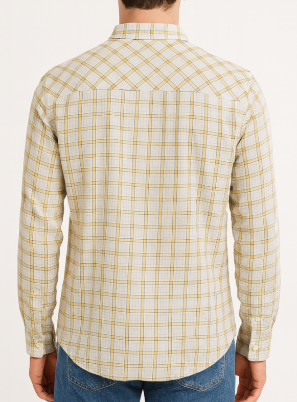Men's Light Beige Checked Casual Shirt, Step into style with this yellow and blue checked cotton shirt tailored for modern men. Crafted from breathable cotton, this shirt features a full button-down front, long sleeves, a standard collar, and a subtle left chest pocket. The pattern is enhanced with yellow and blue check lines on a cream base, offering a versatile look suitable for both casual and smart-casual settings. The back panel features a uniquely cut yoke in diagonal checks for added visual appeal.