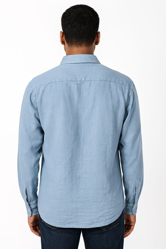 Men’s Light Blue Cotton Casual Shirt, Relaxed-fit sky blue cotton shirt with full sleeves, spread collar, and a single chest pocket. Features a plain back with a horizontal yoke and soft woven texture.