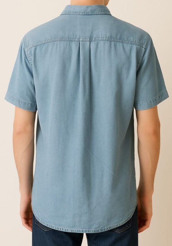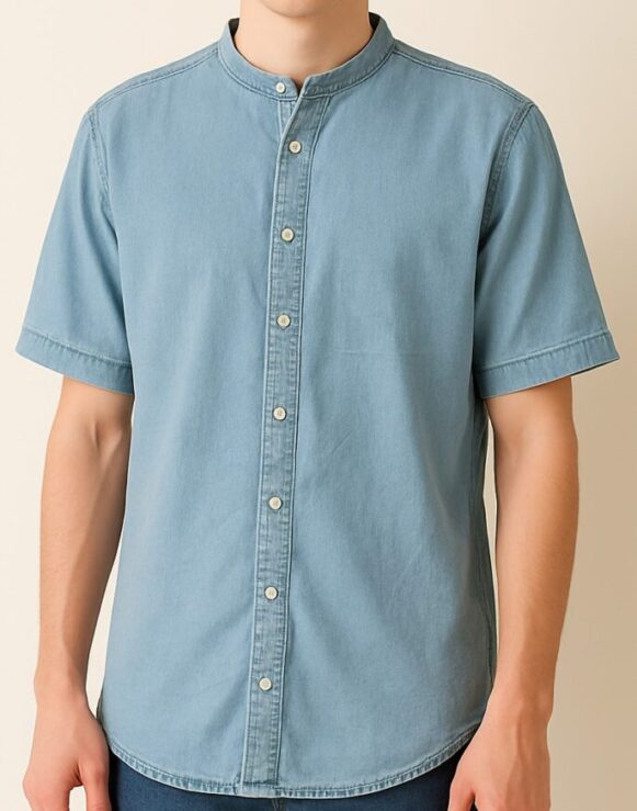 Men's Light Blue Denim Shirt, This men's short sleeve shirt is crafted from soft denim fabric in a light blue wash, offering a comfortable and casual look. It features a mandarin collar for a modern twist on classic shirting, a full front button placket with white buttons, and a curved hemline for a flattering silhouette. The back panel is clean with a central box pleat for added comfort and ease of movement. Perfect for smart-casual styling or weekend outings.