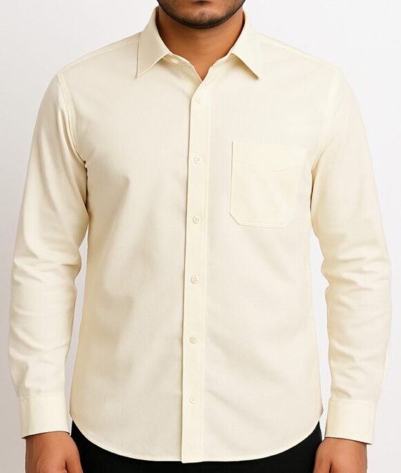 Men’s Light Cream Cotton Formal Shirt, Men’s solid light cream long sleeve shirt with point collar, single chest pocket, and regular fit.