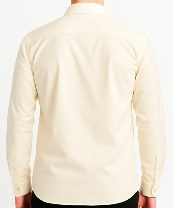 This men’s solid light cream long-sleeve shirt offers a clean and classic style suitable for both formal and casual occasions. Crafted from a smooth, comfortable fabric, it features a standard point collar, a neatly stitched front placket with matching buttons, and a single chest pocket for a touch of utility. The long sleeves come with buttoned barrel cuffs, while the back is kept plain for a streamlined look. Designed for a regular fit, it ensures all-day comfort and easy pairing with trousers or jeans.