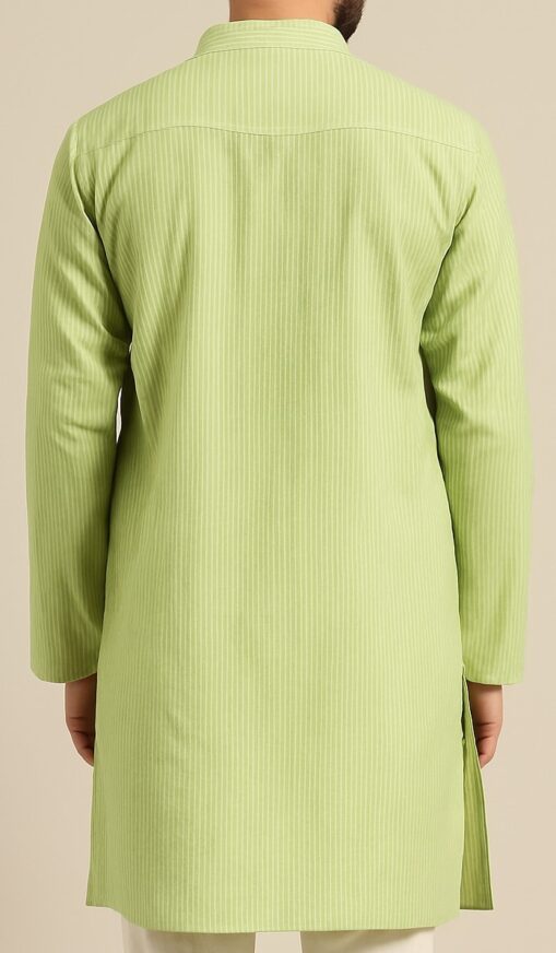 This light green men’s kurta features subtle vertical white stripes, crafted in soft and breathable cotton fabric. It comes with a mandarin collar and a half-button placket with five buttons for a classic ethnic look. Full sleeves and a straight hem with side slits provide ease of movement. Ideal for festive, semi-formal, or casual wear, this kurta combines traditional elegance with modern comfort.